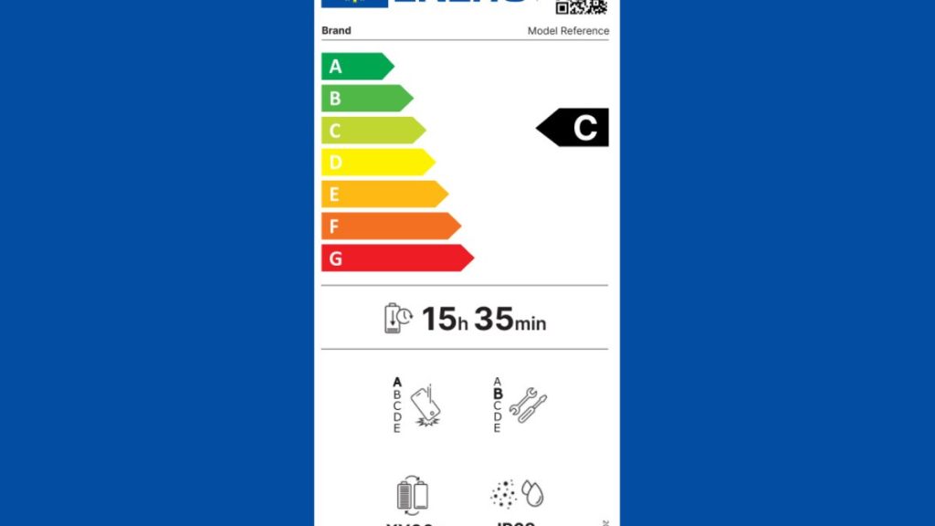 Etiketler üzerinde, eserin A’dan G’ye kadar bir ölçekte güç verimliliği sınıfı, derecelendirildiği şarj döngüsü sayısıyla birlikte pil ömrü bilgisi, dayanıklılık ve onarılabilirlik için harf notları ve toza/suya karşı müdafaa için geçerli IP derecesi üzere bilgiler yer alacak.